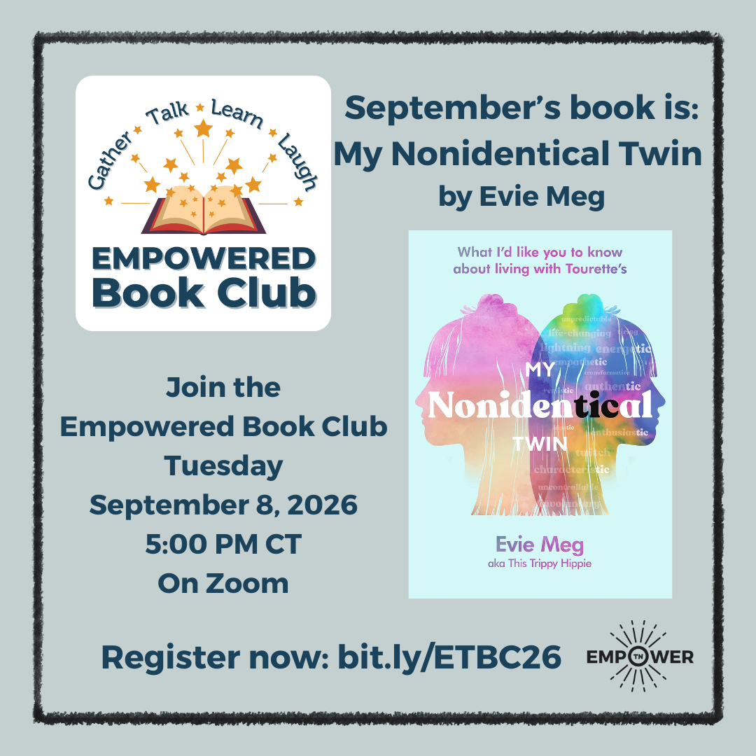 Join us for the Empowered Book Club! We’ll be discussing the book, “My Nonidentical Twin: What I’d like you to know about living with Tourette’s” by Evie Meg.